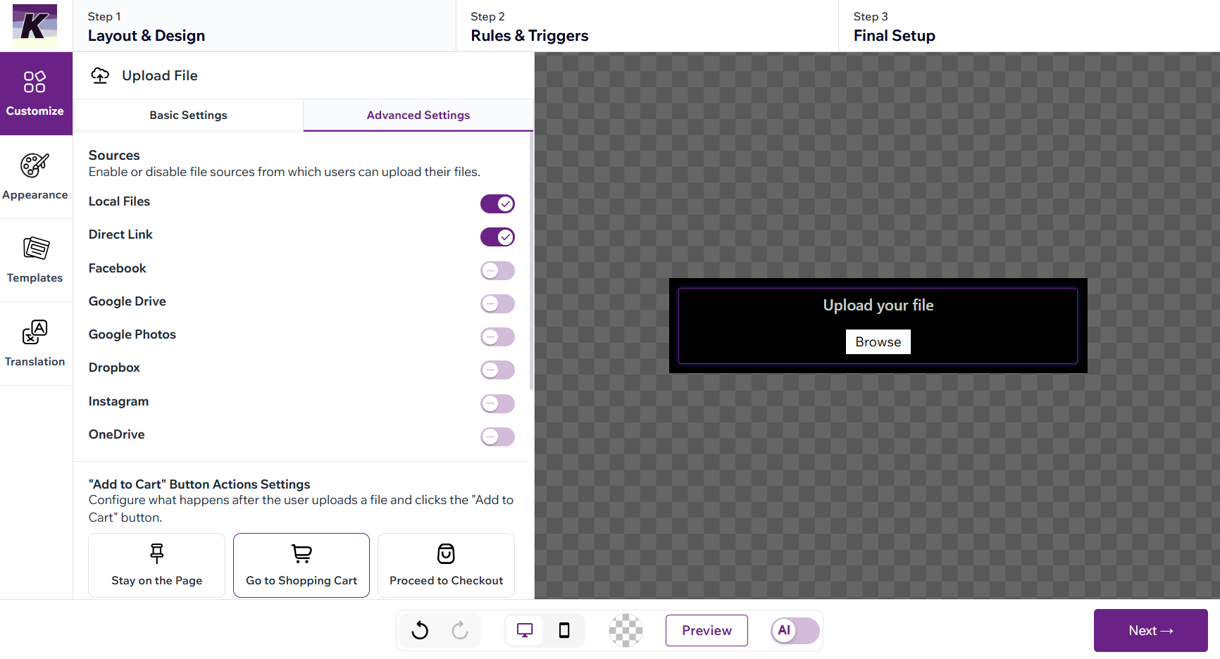 Let customers upload from their device or select cloud options like Google Drive, Instagram, Dropbox, and more.